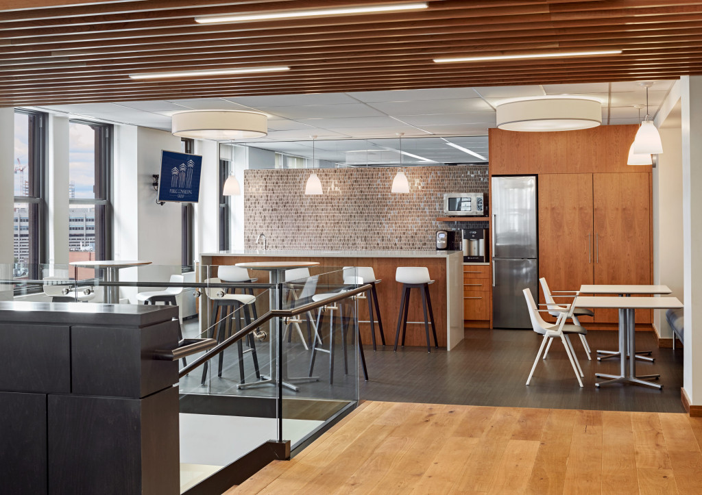 Callahan completed work on this 6,700 SF, high-end renovation to the 10th and 11th floors of 148 State Street. The scope of work included the installation of an internal stairway from the 10th to 11th floor, 1st floor lobby renovation and refinished elevators. Work also included a reception desk with integrated lighting and slats that continue onto the ceilings, demountable glass partitions, blinds throughout the 10th and 11thfloors, new carpet, tile, ACT ceiling and exposed deck, as well as new HVAC and a high end lighting package.