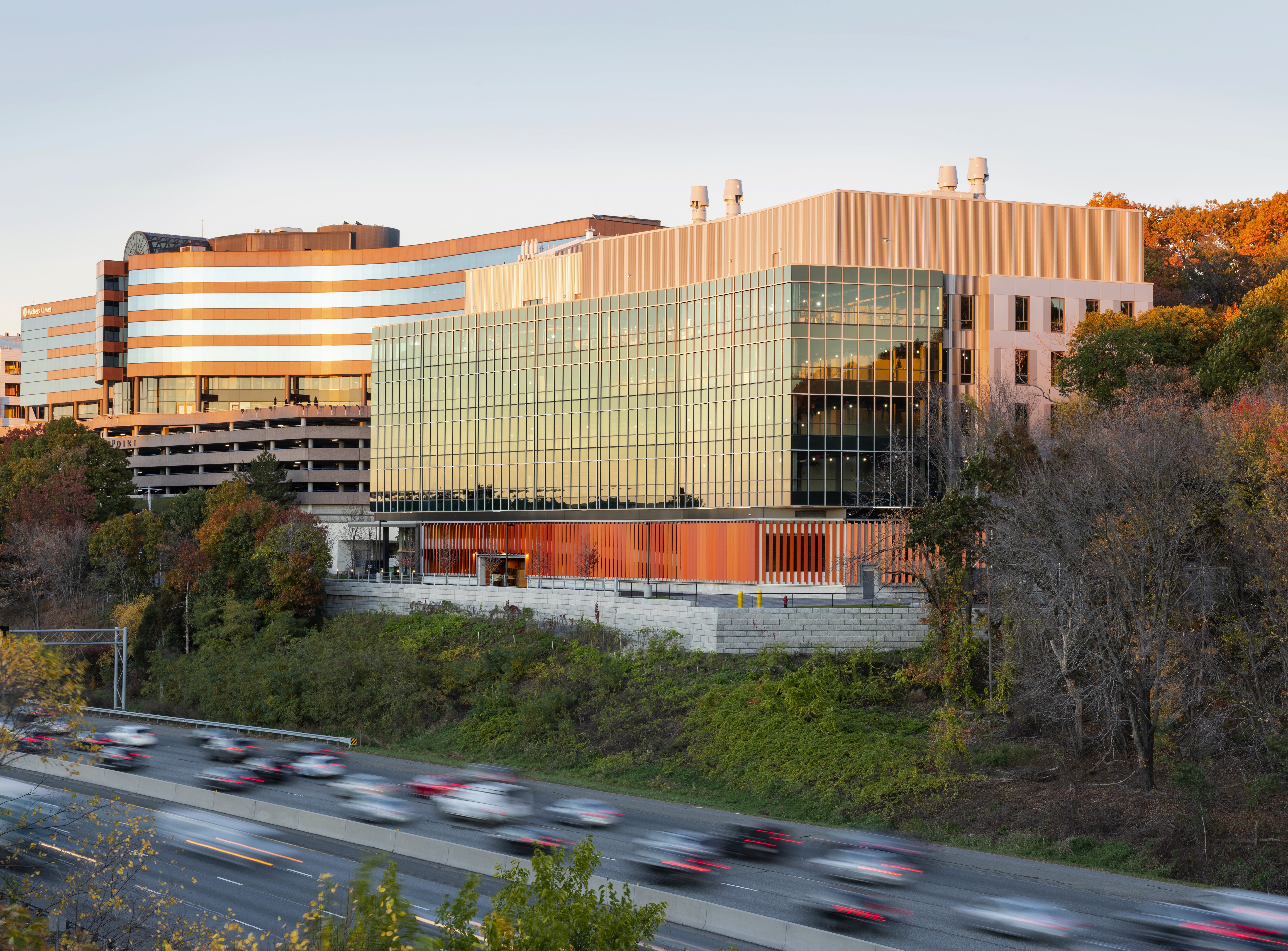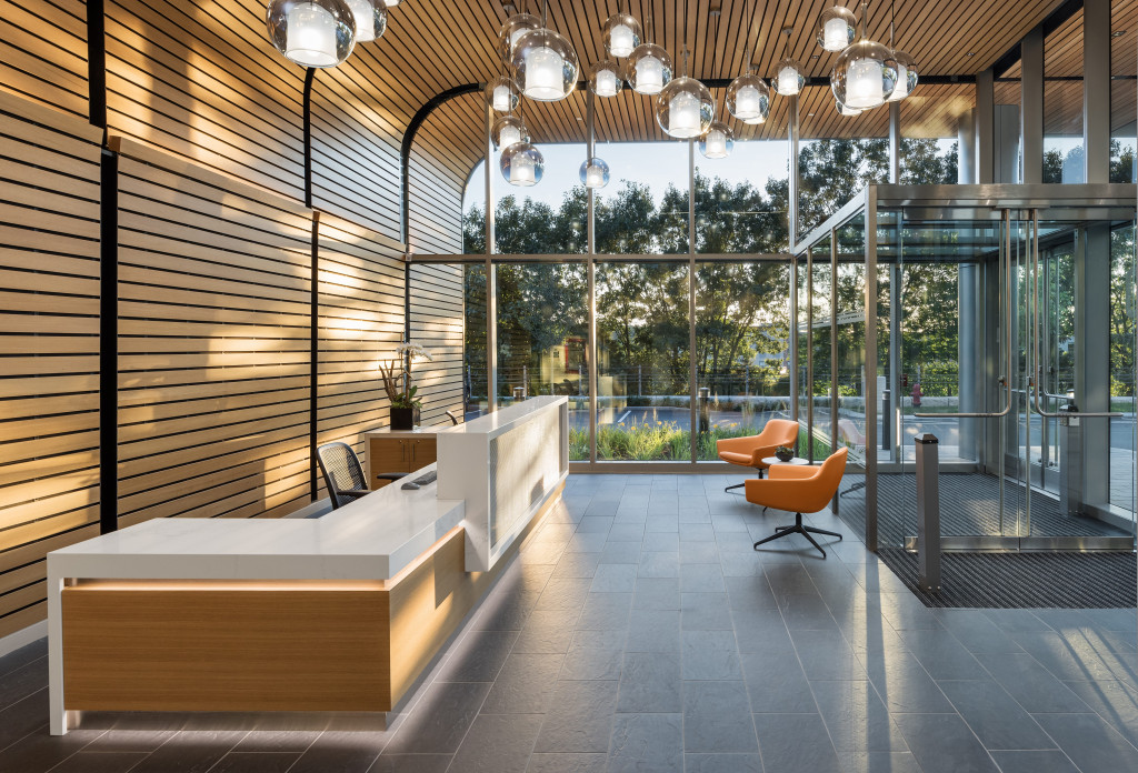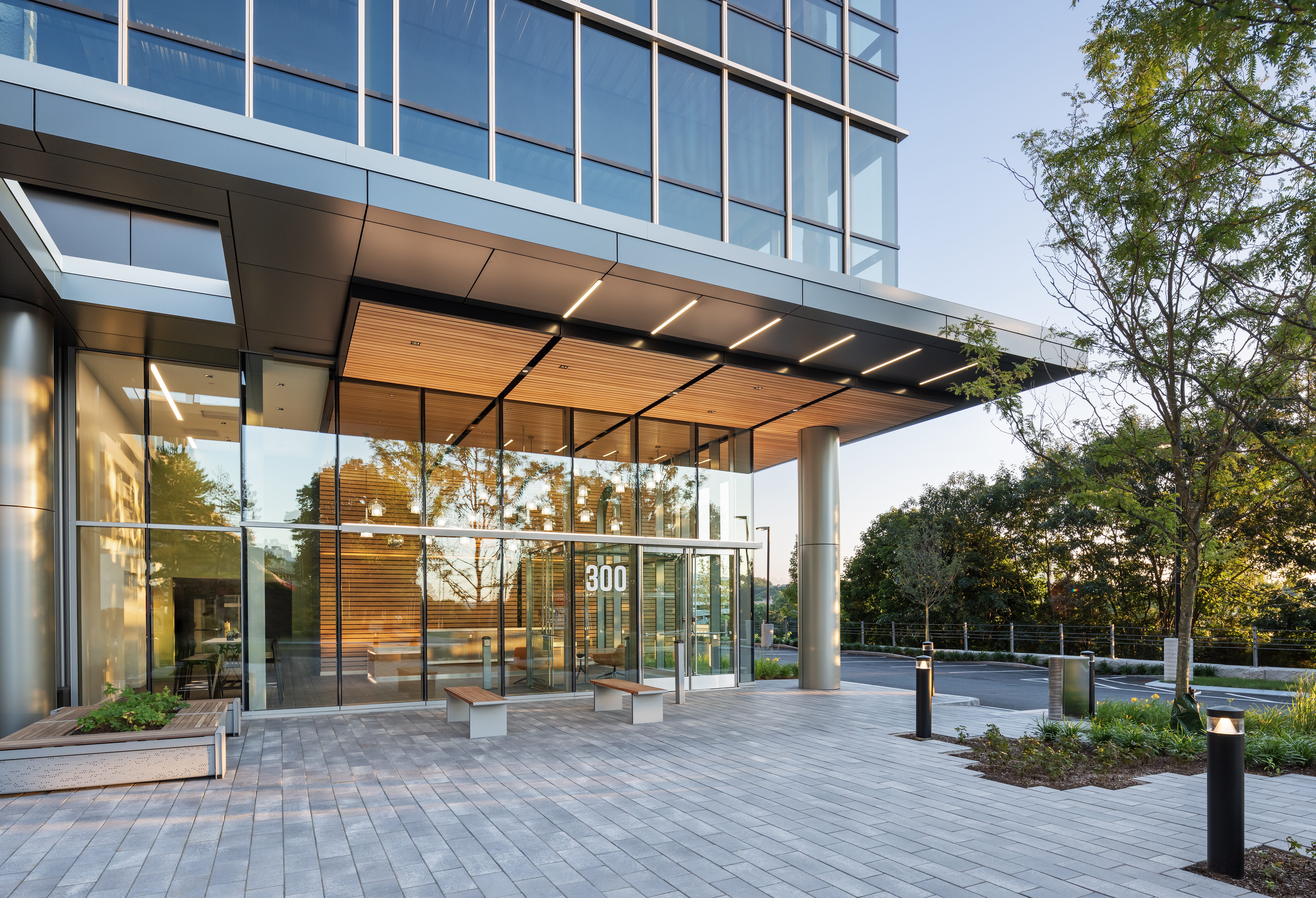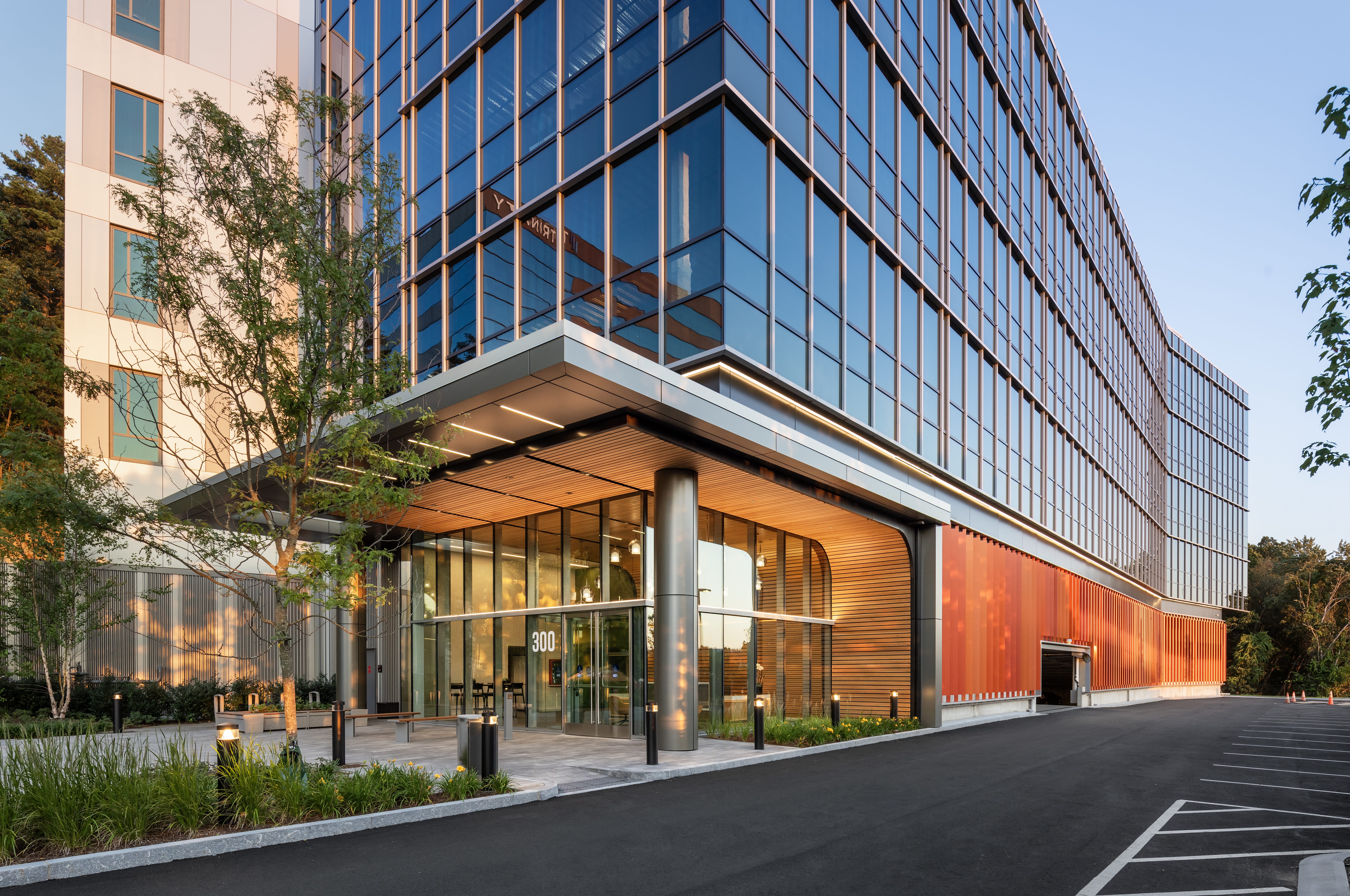 The project features 4 stories of flexible and customizable office and laboratory space with 5 levels of parking, 2 above grade and 3 below, as well as a mechanical penthouse. The 140,000 SF building, 30,000 SF per floor, features a poured concrete foundation with a steel frame concrete deck. Facing the Route 128 corridor, an expansive glass curtain wall wraps the façade bringing light and views into the spaces. Metal panels and punched windows wrap the spaces with views to a dramatic natural rock face on the property. The lobby includes a glass entrance with natural wood ceiling and wall and custom lighting.