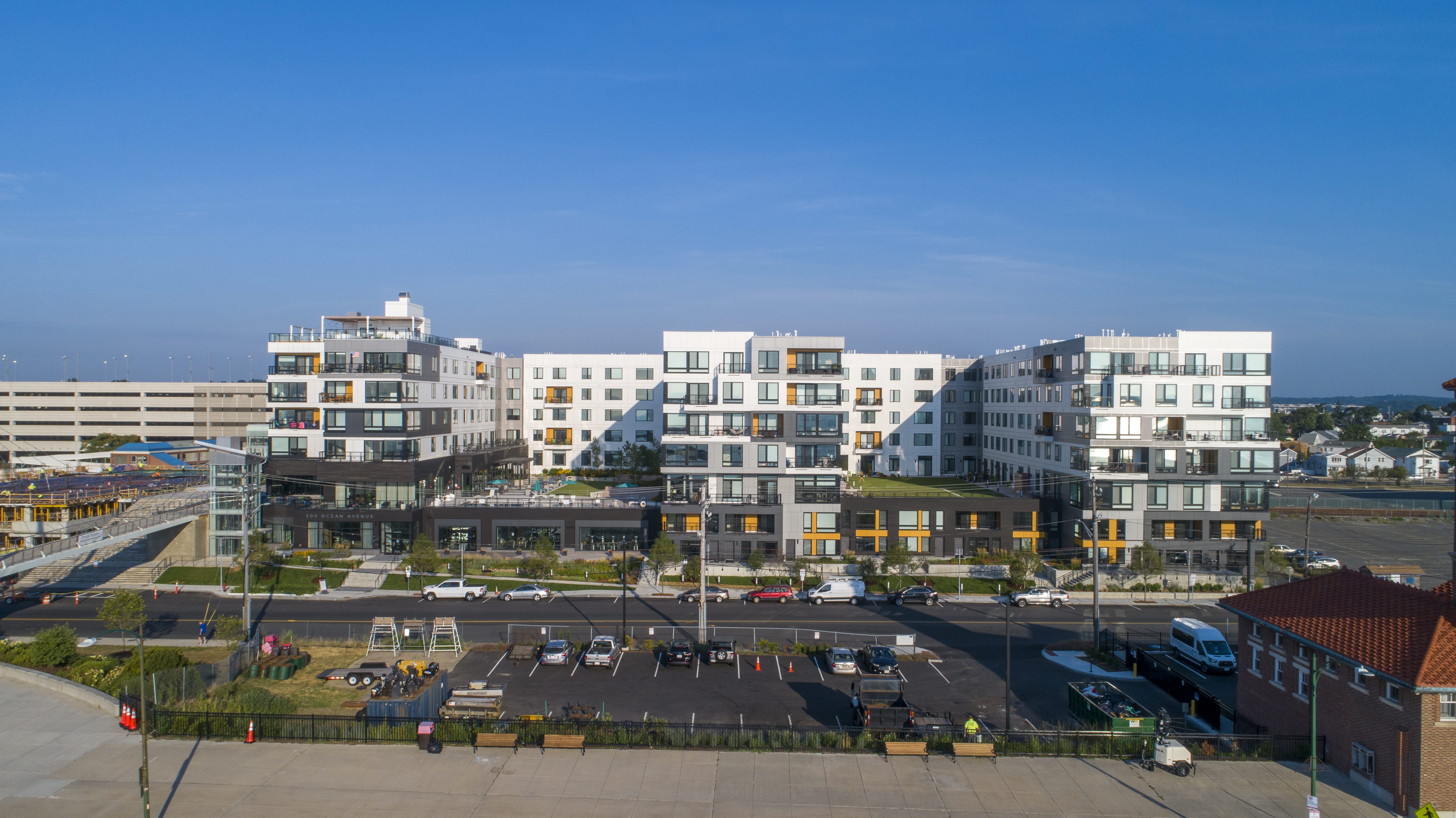500 Ocean Ave is a new mixed-use development located on Ocean Avenue in Revere, MA. It consists of 2 levels of podium parking, plaza level retail space and 305 residential units along with indoor and outdoor amenities. The building is constructed with 5 levels of wood framing above 2+ levels of structural steel podium. The development is connected to an existing MBTA pedestrian plaza.