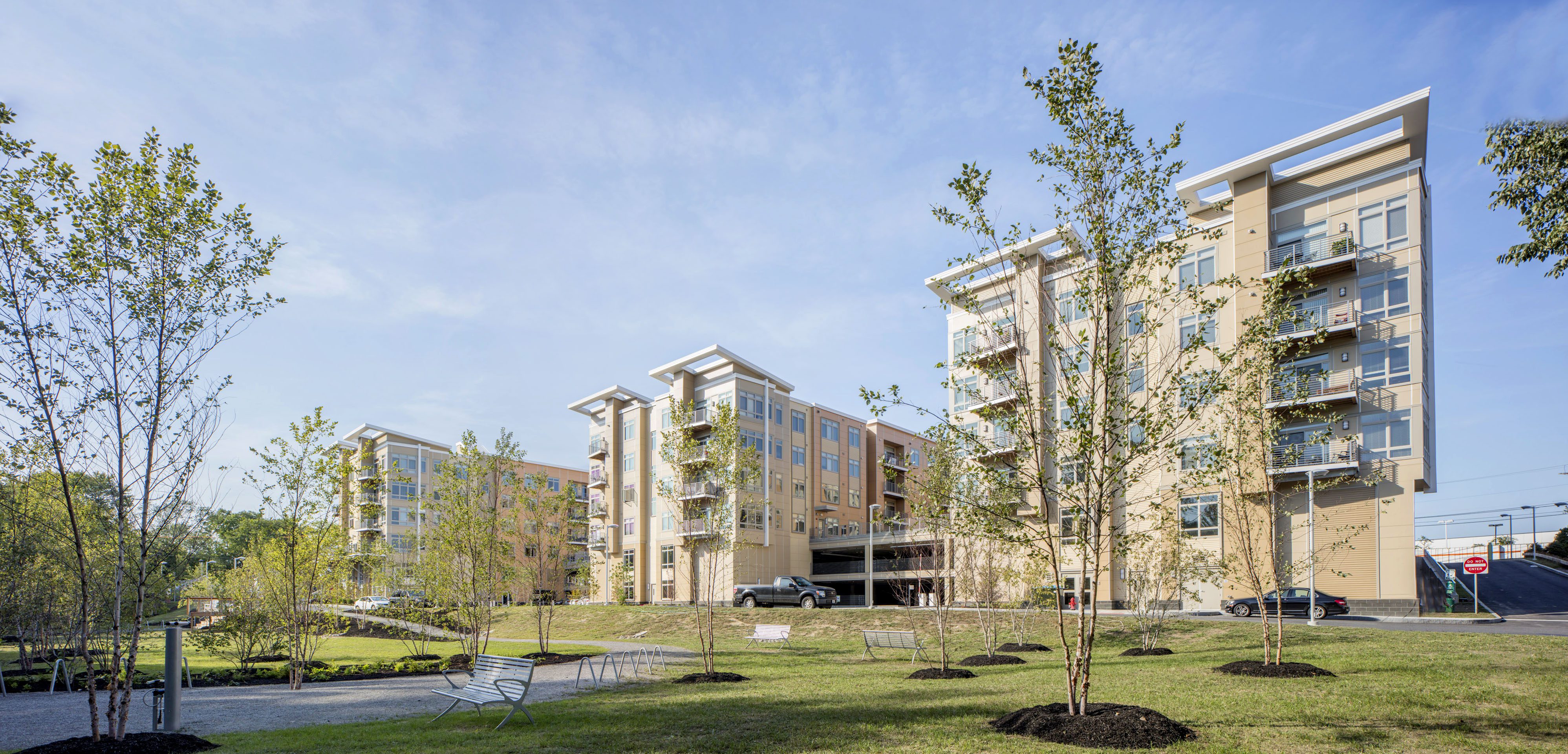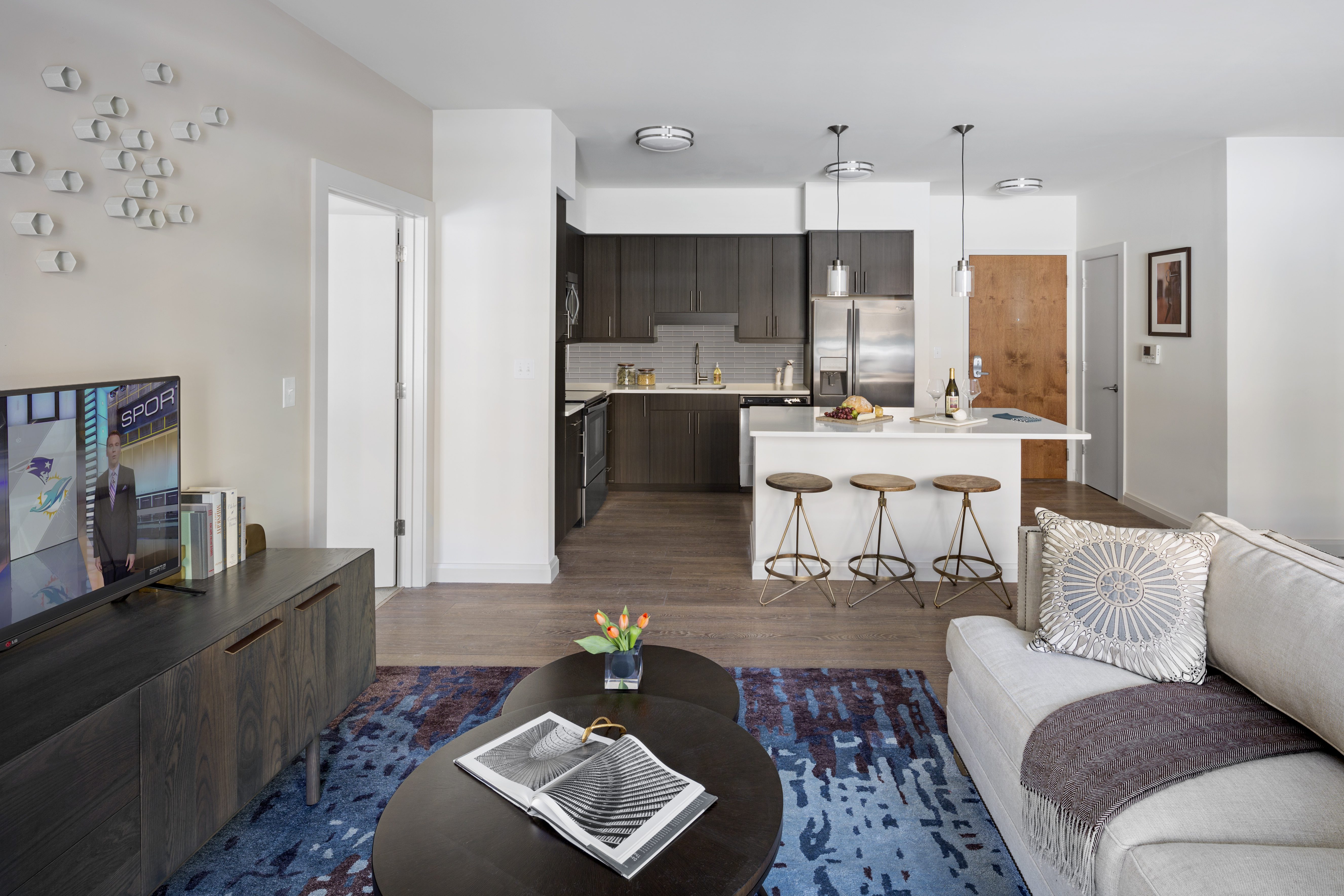 The E-shaped building hosts 200 rental luxury apartments and a package of high-end amenities such as a resort-style swimming pool, a state-of-the-art fitness center and sports lounge and an internet café. Each unit is equipped with stone countertops, stainless steel appliances, high-quality cabinets and lighting and an open kitchen/living design with all-wood floors. Many units have private balconies or patios overlooking the river. The 4-story residential building clad in brick along the urban street sides also includes an underground parking garage on 2 levels that offer up to 400 parking spaces.