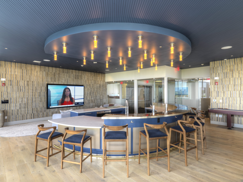 project is 6 stories tall and amenities are centrally located in the building on the 1st and 6th floors. The 1st floor houses a fitness area,