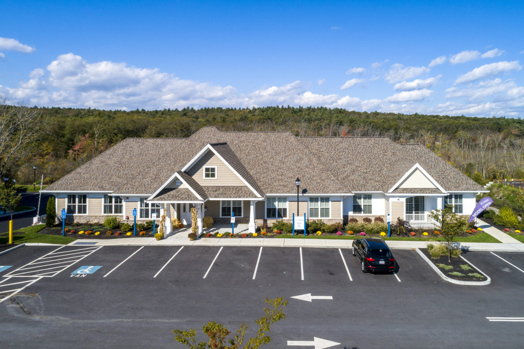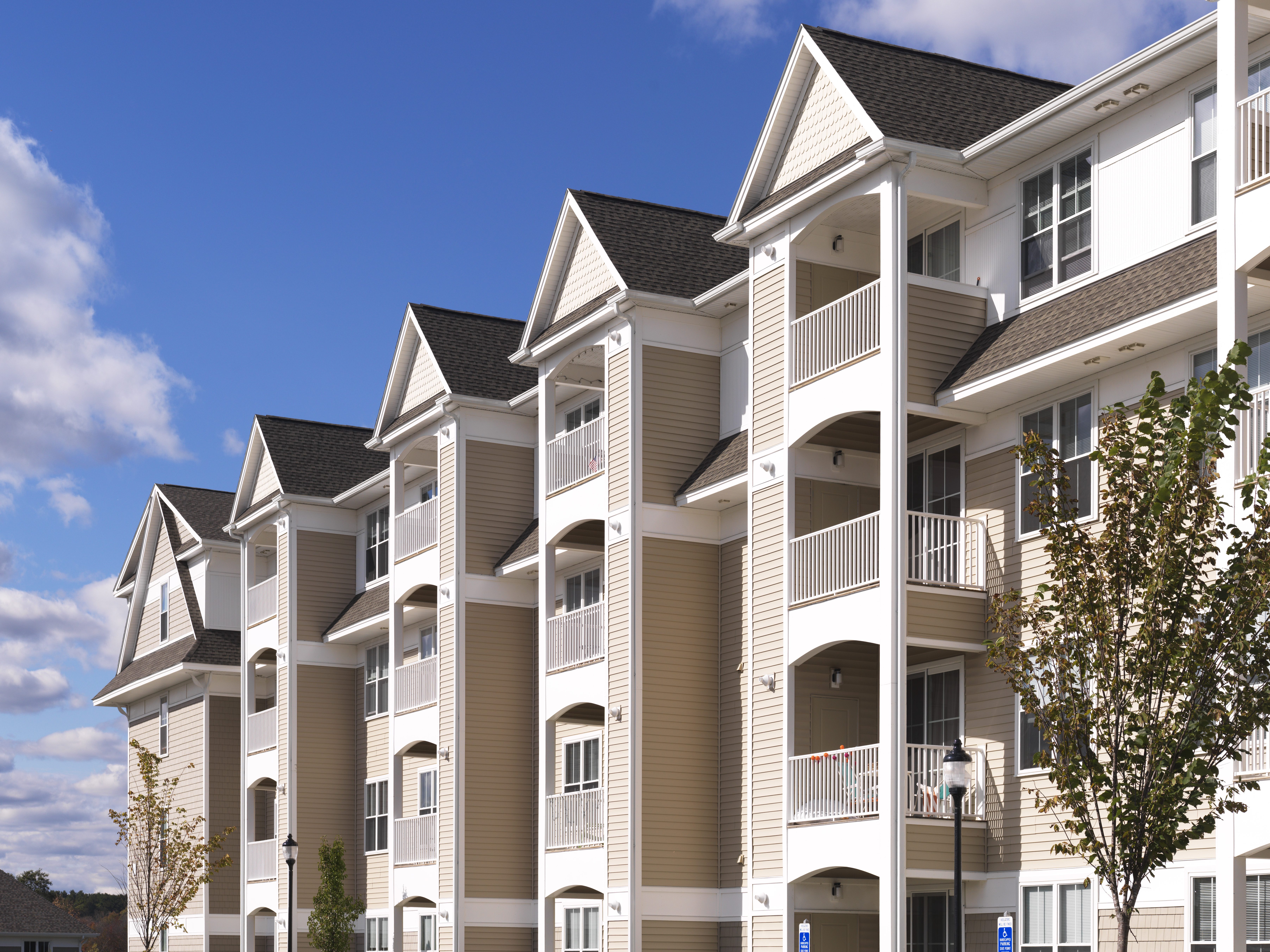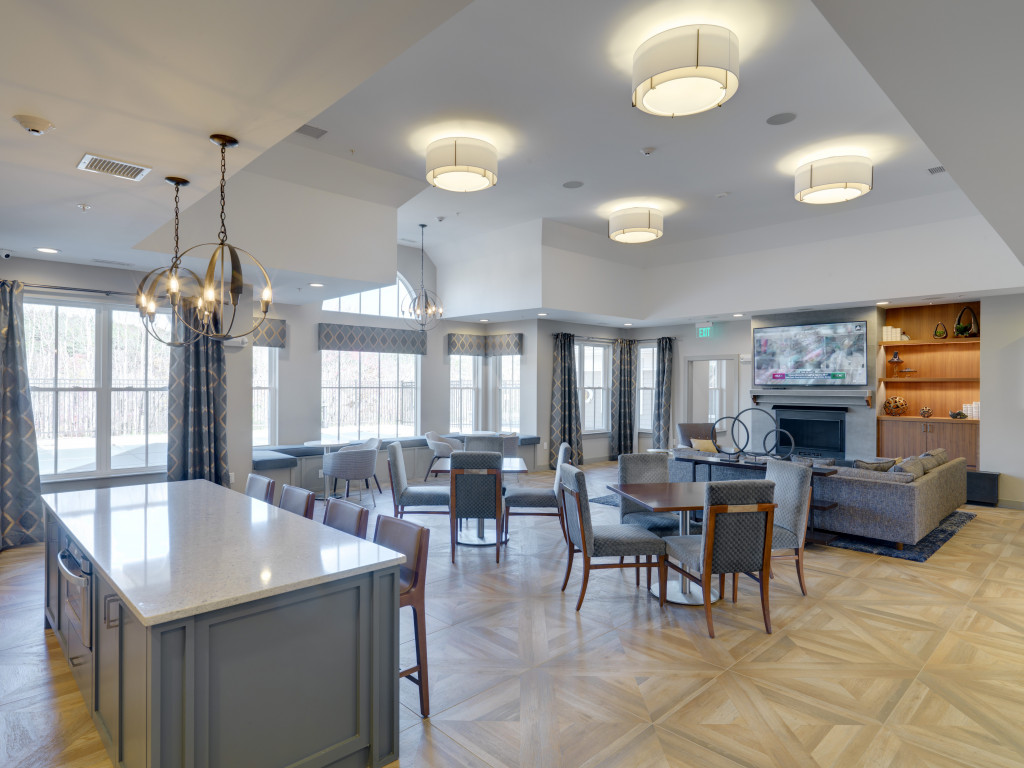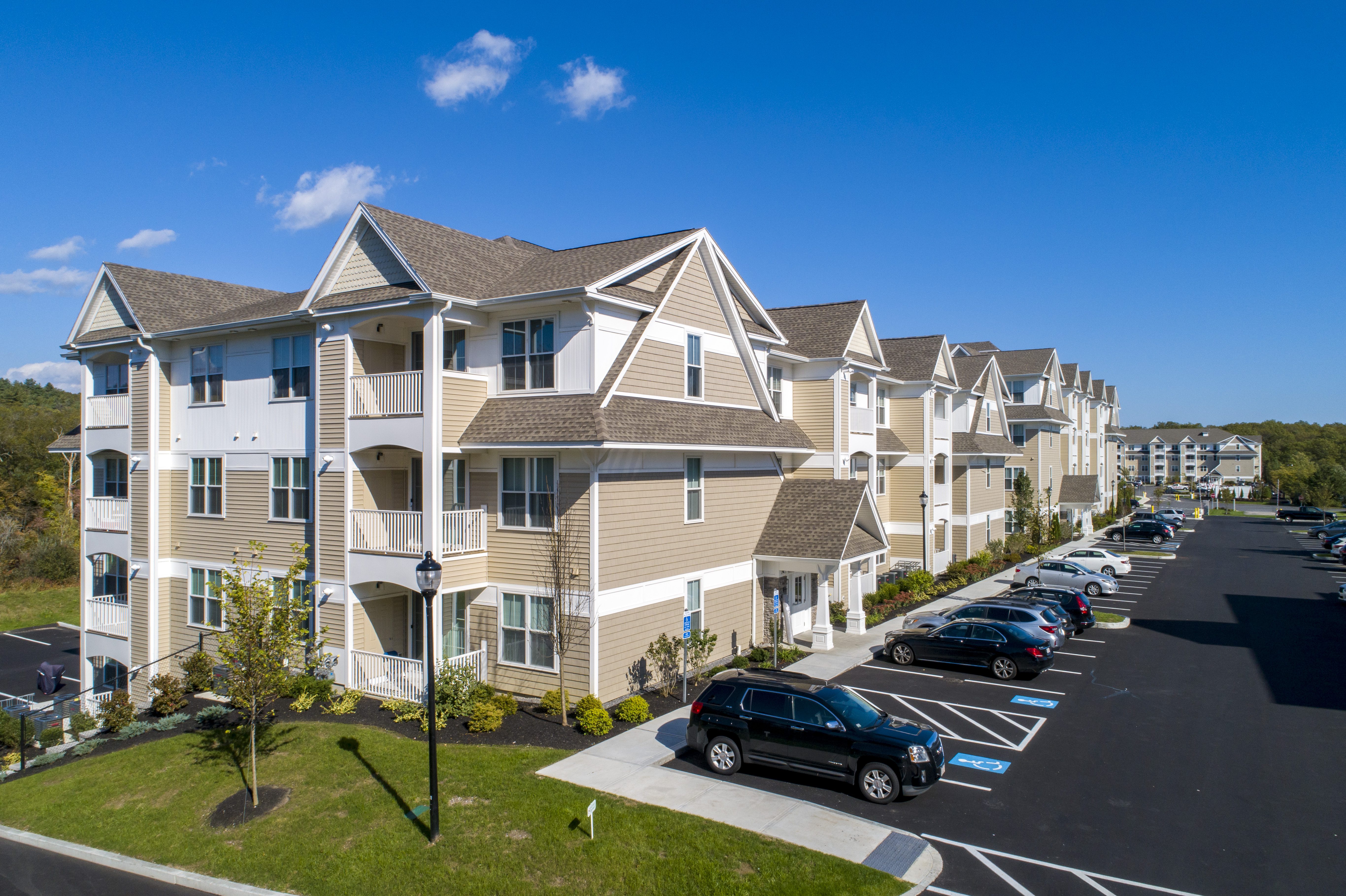 The project consists of 8 buildings, including four 5-story and two 6-story apartment complexes. There is a total of 492 units with a mix of studio, 1-2-bedroom apartments, with 300 garage parking locations with additional parking locations uncovered. Units range from 550 SF to 1,400 SF. The building façade is a combination of fiber cement panels and 4” brick veneer. Amenities include a clubhouse, consisting of the leasing office, a lounge with fireplace and TV, a seating area with fireplace, a clubroom with bar, fitness room, swimming pool, a large man made pond and a “Central Park” area, all located in the center of the resident buildings.
